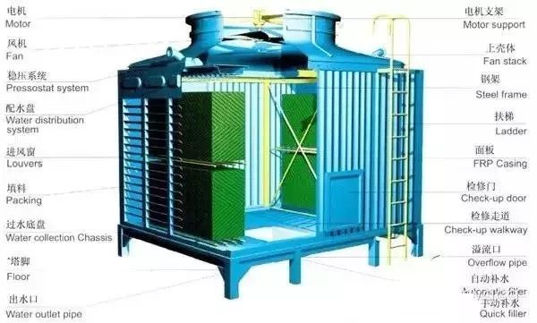 工業生產或制冷工藝過程中產生的廢熱,一般要用冷卻水來導走。冷卻塔的作用是將挾帶廢熱的冷卻水在塔內與空氣進行熱交換,使廢熱傳輸給空氣并散入大氣中。
