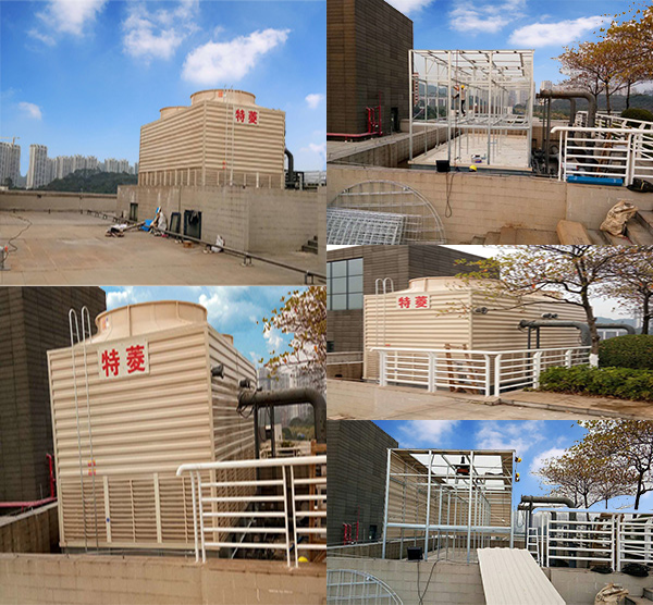 惠州東江環保橫流方形冷卻塔安裝 廣東特菱空調(http://m.shmingyuan.com)方形橫流式玻璃鋼冷卻塔結構特點: (1)擋板:玻璃鋼材質,表面光滑美觀,耐腐蝕,防老化。 (2)填料:改性聚氯